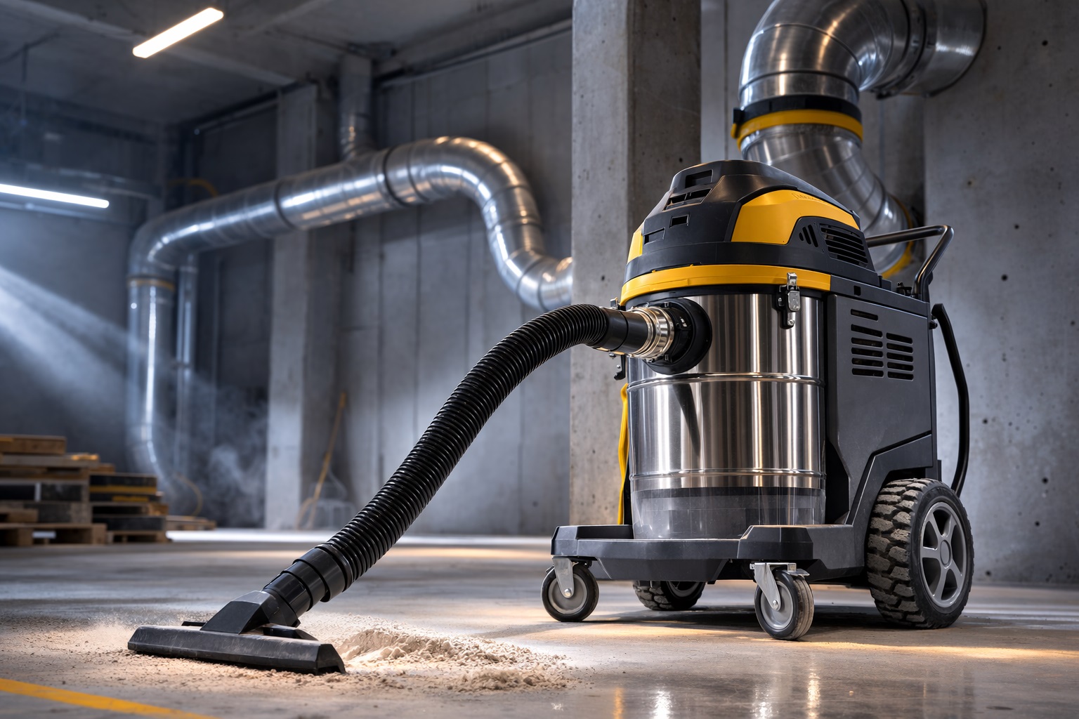 A robust industrial wet dry vacuum handles both liquid and dry materials efficiently.